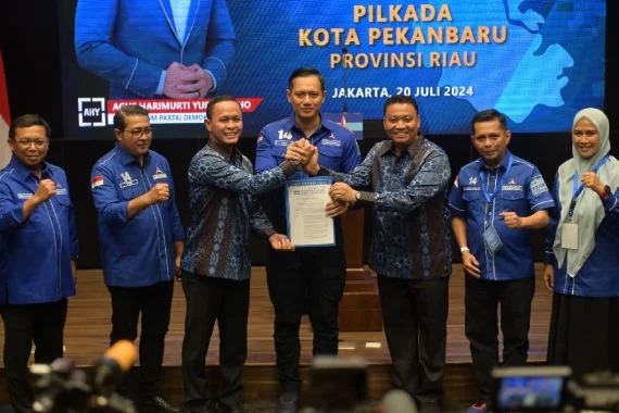 Jakarta – Ketua Umum Partai Demokrat Agus Harimurti Yudhoyono (AHY) menyerahkan secara resmi Surat Keputusan (SK) dukungan dari Partai Demokrat kepada Bakal Calon Walikota dan Wakil Walikota Pekanbaru Agung Nugroho – Markarius Anwar (AMAN) di Kantor DPP Partai Demokrat, Sabtu (20/7/2024).
