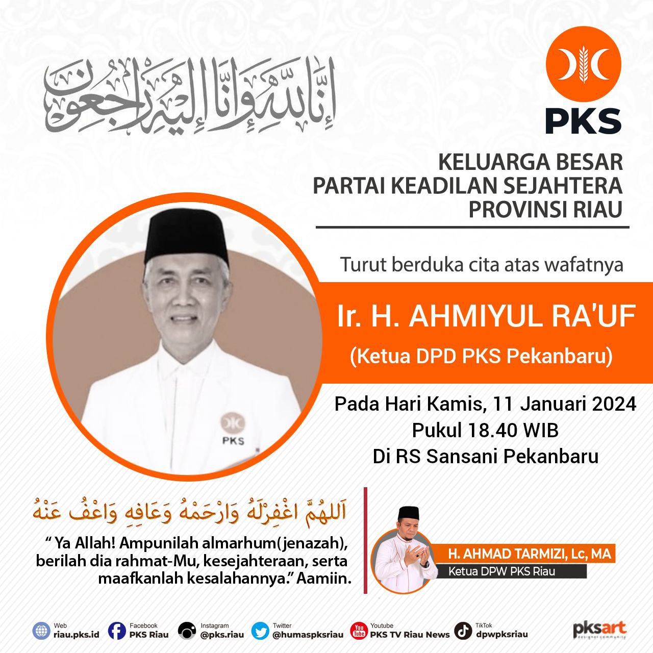 Pekanbaru – Innalillahi wa innailaihi rooji’uun. Kota Pekanbaru dan khususnya keluarga besar Partai Keadilan Sejahtera (PKS), tetiba mendapatkan kabar duka yang cukup mengejutkan, Ketua Dewan Pimpinan Daerah (DPD) PKS Pekanbaru Ir H Ahmiyul Rauf meninggal dunia. Sesaat sedang berjalan menuju Masjid hendak menunaikan Sholat Magrib Kamis 11/1/2024.
